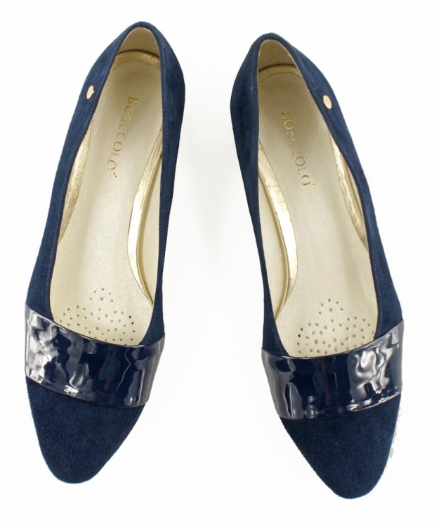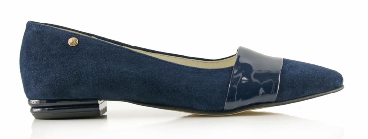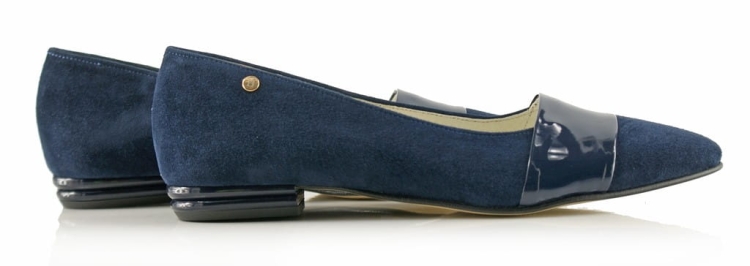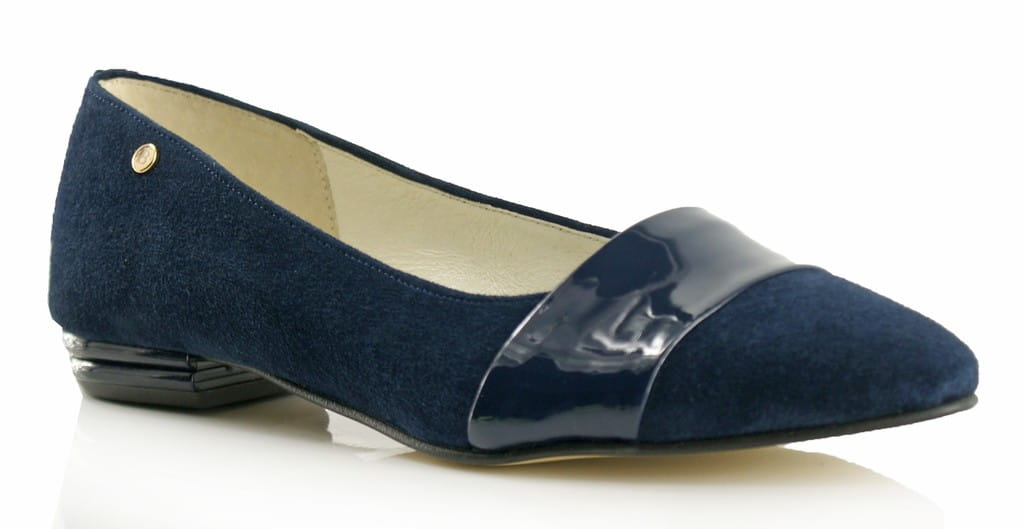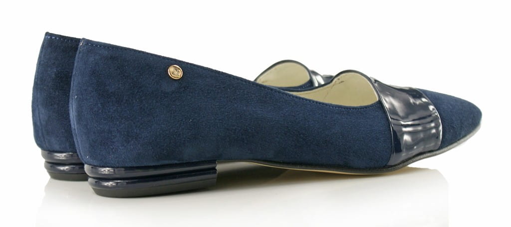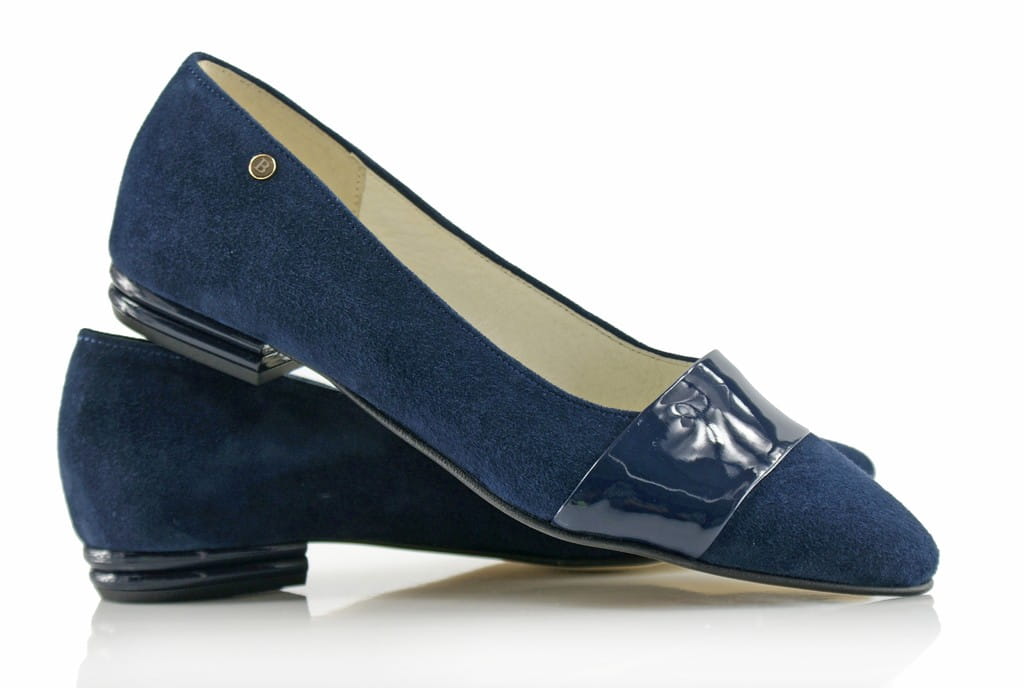 Eleganckie buty damskie z rodzaju balerin, wykonane ze skóry naturalnej, zamszowej z lakierowanym paskiem dekoracyjnym.