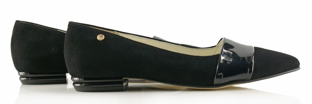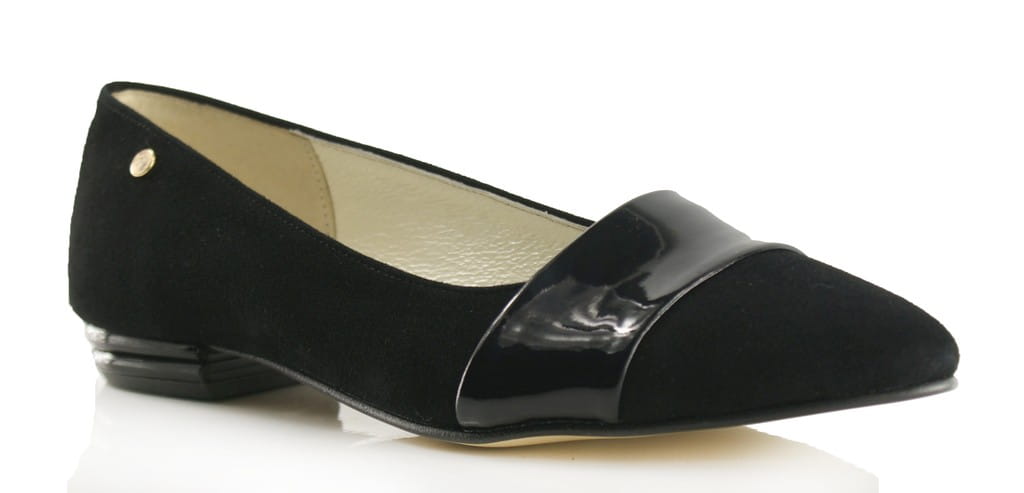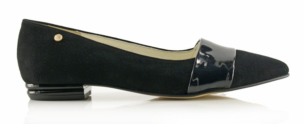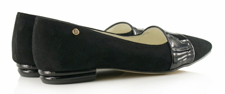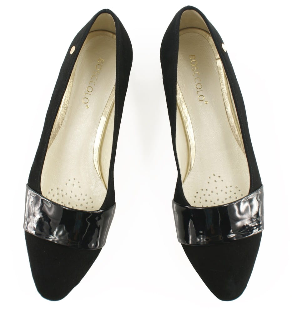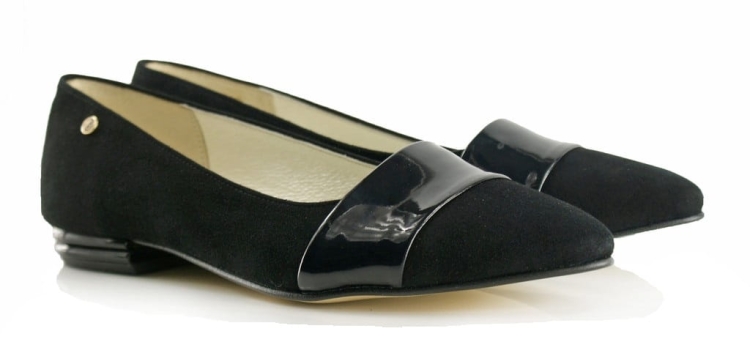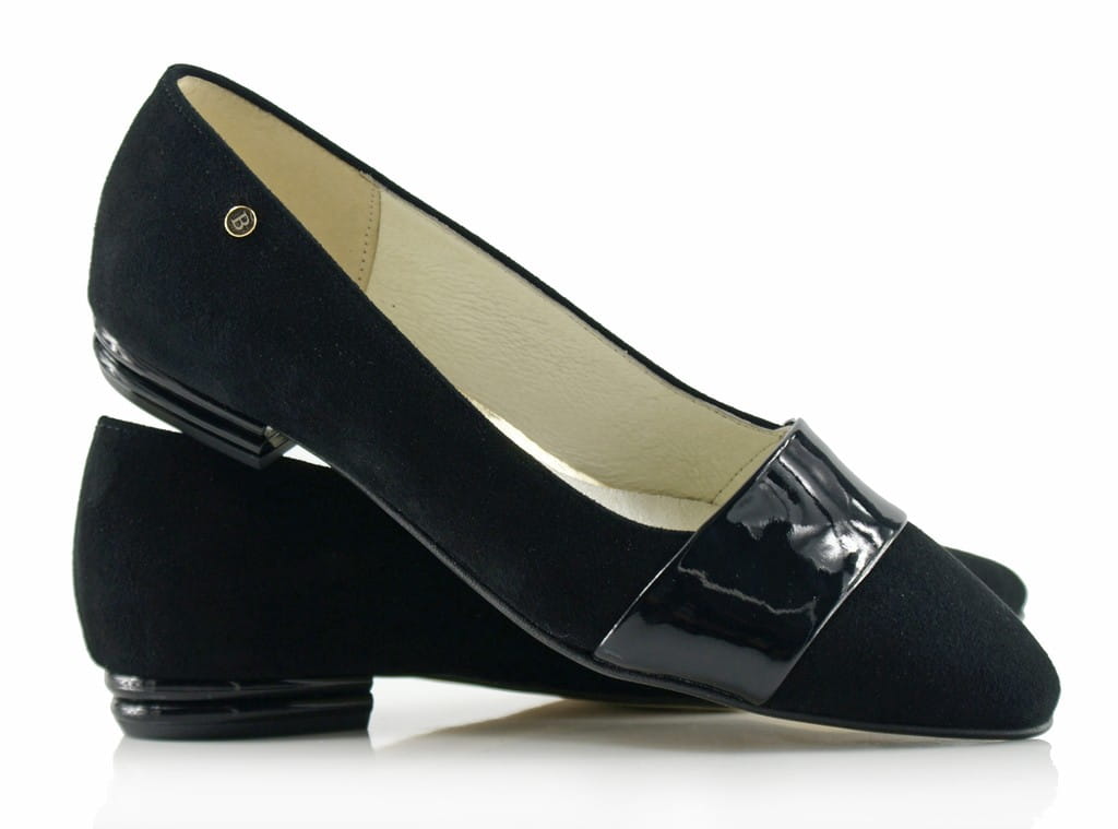 Eleganckie buty damskie z rodzaju balerin, wykonane ze skóry naturalnej, zamszowej z lakierowanym paskiem dekoracyjnym.