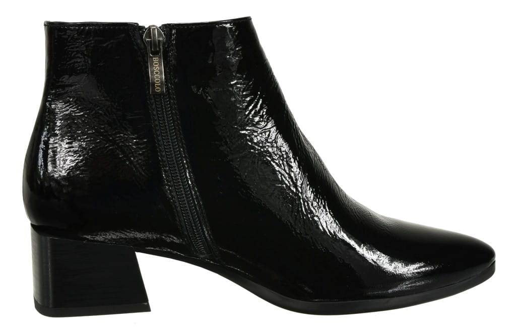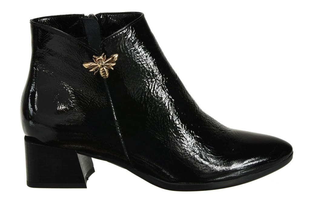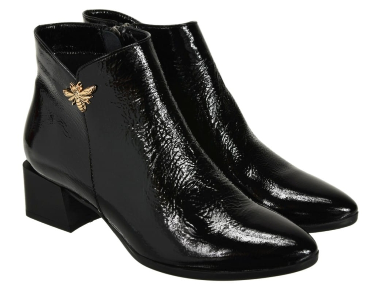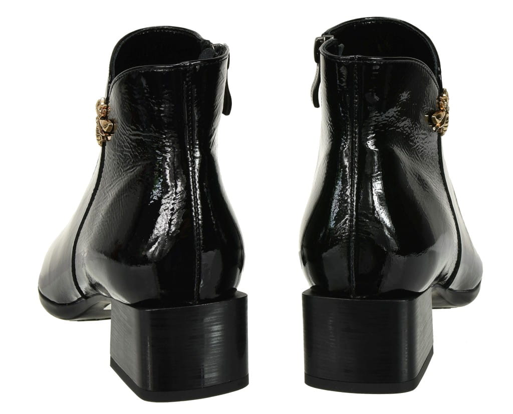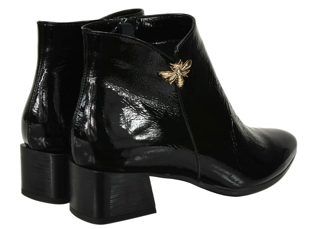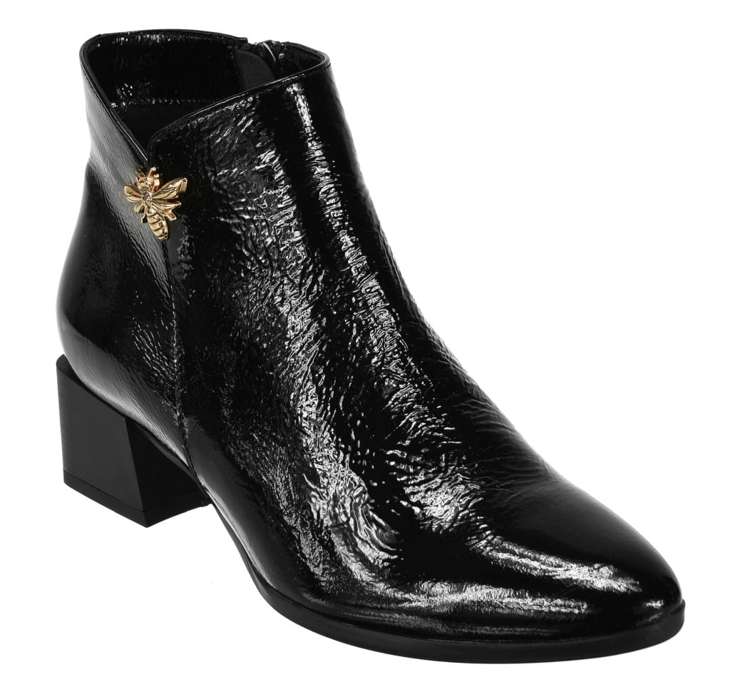 Nowoczesne botki damskie wykonane ze skóry naturalnej, lakierowanej, zmięty wygląd .