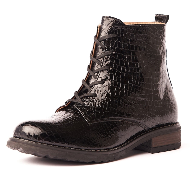 Eleganckie botki skórzane z naturalnej skóry lakierowanej o fakturze skóry krokodyla.