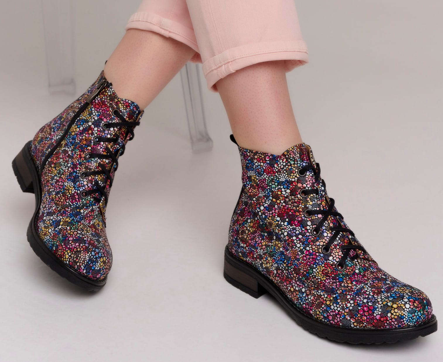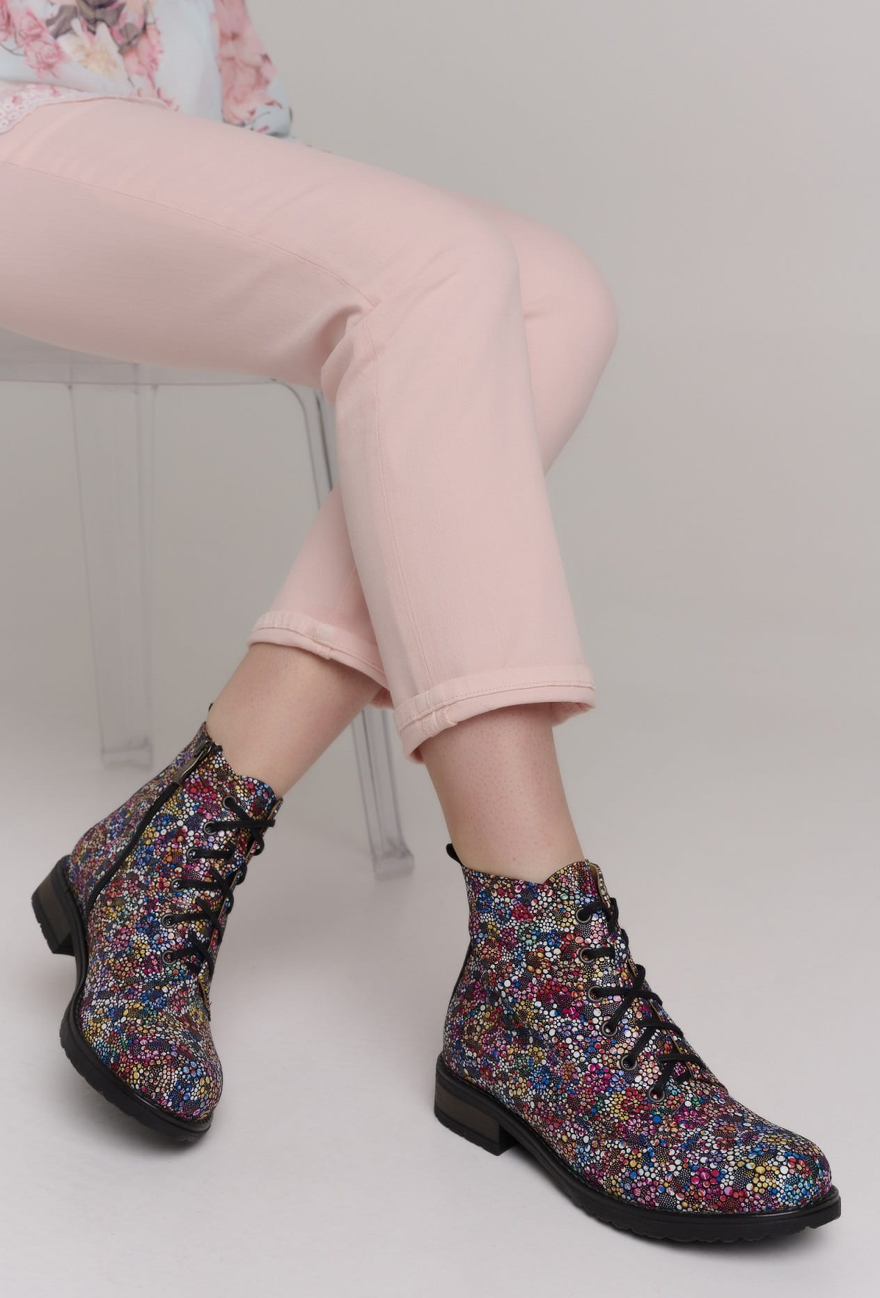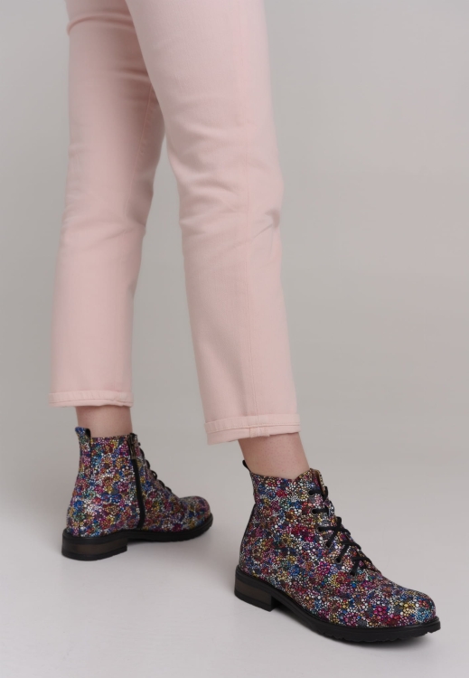 Eleganckie botki skórzane z naturalnej skóry z kolorowym printem- kwiatki.