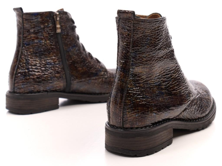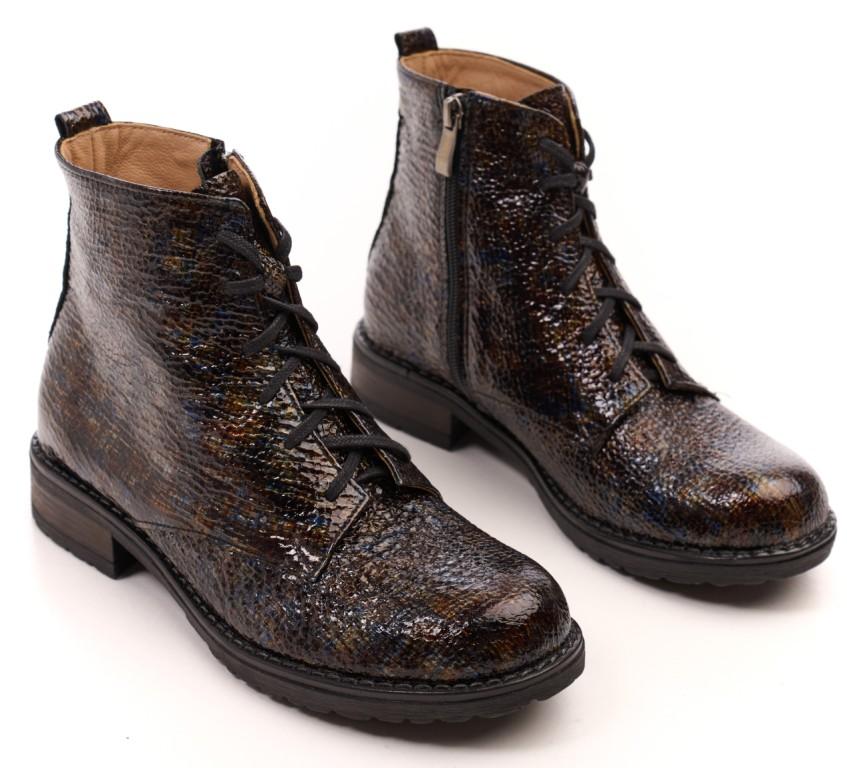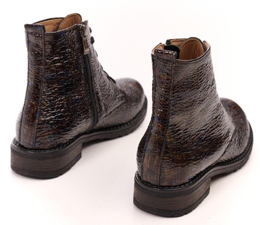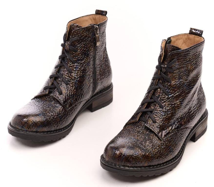 Eleganckie botki skórzane z naturalnej skóry lakierowanej, o lekko nieregularnej fakturze.