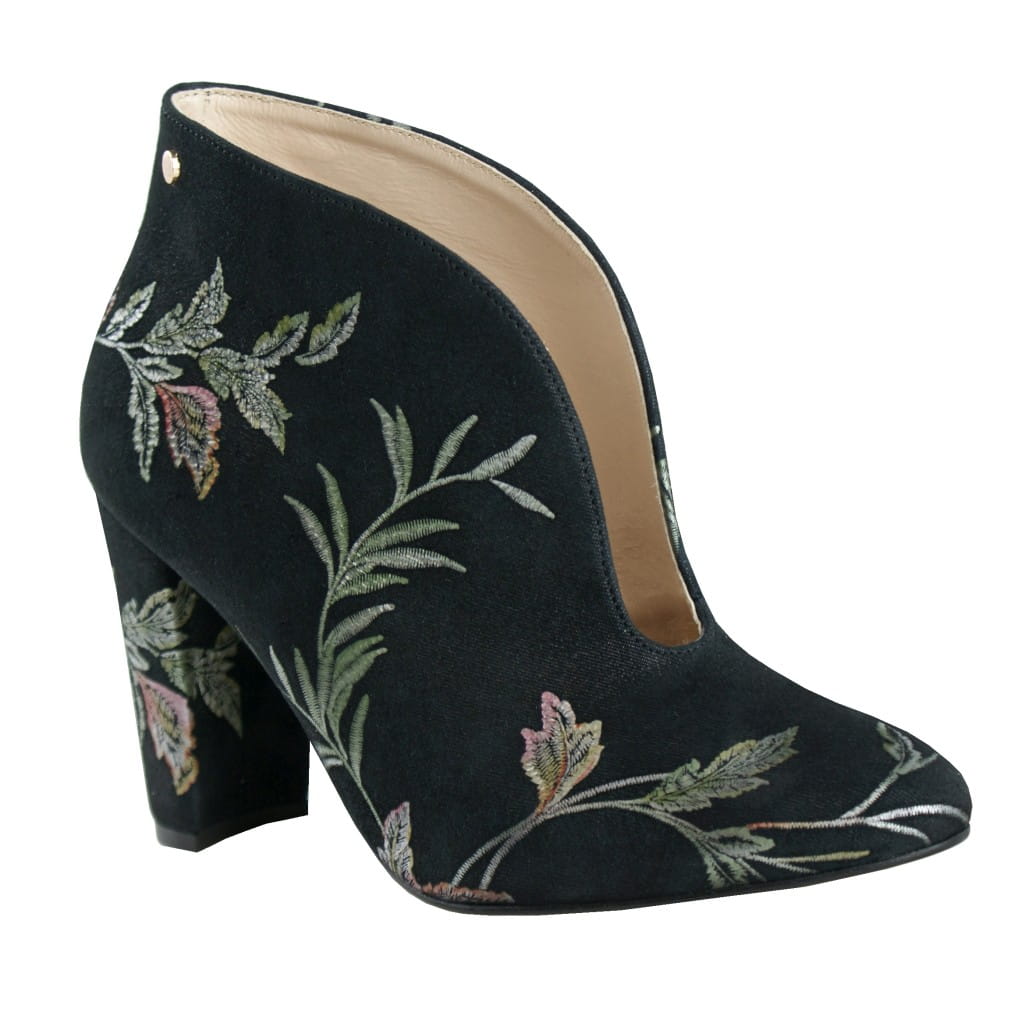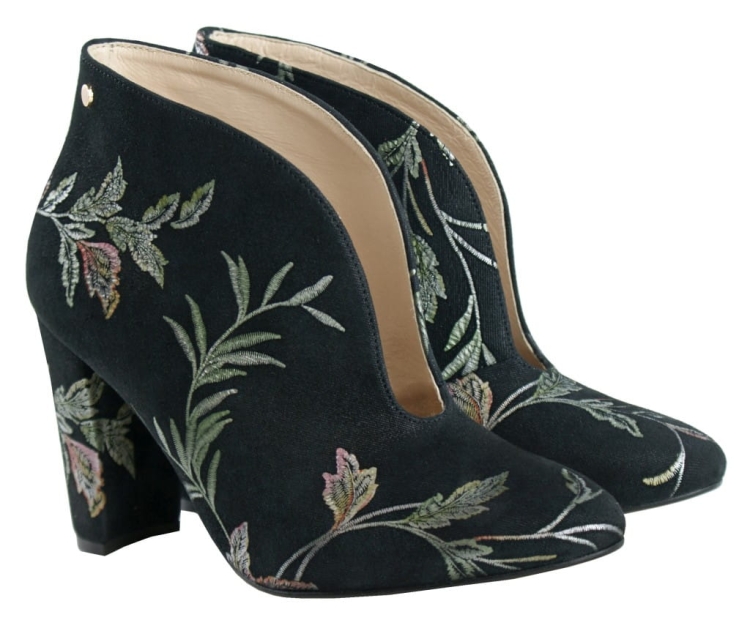 Skórzane botki na obcasie, ze zamszowej skóry naturalnej, ozdobny haft, wsuwane.