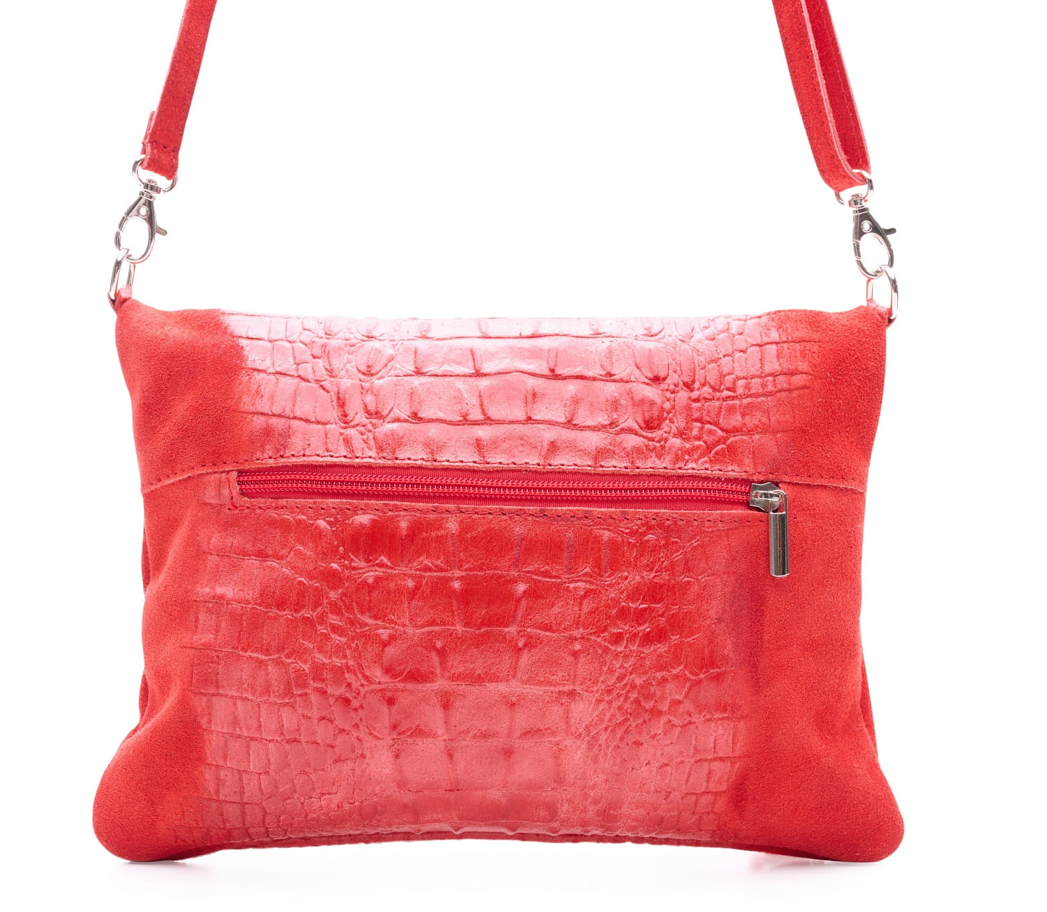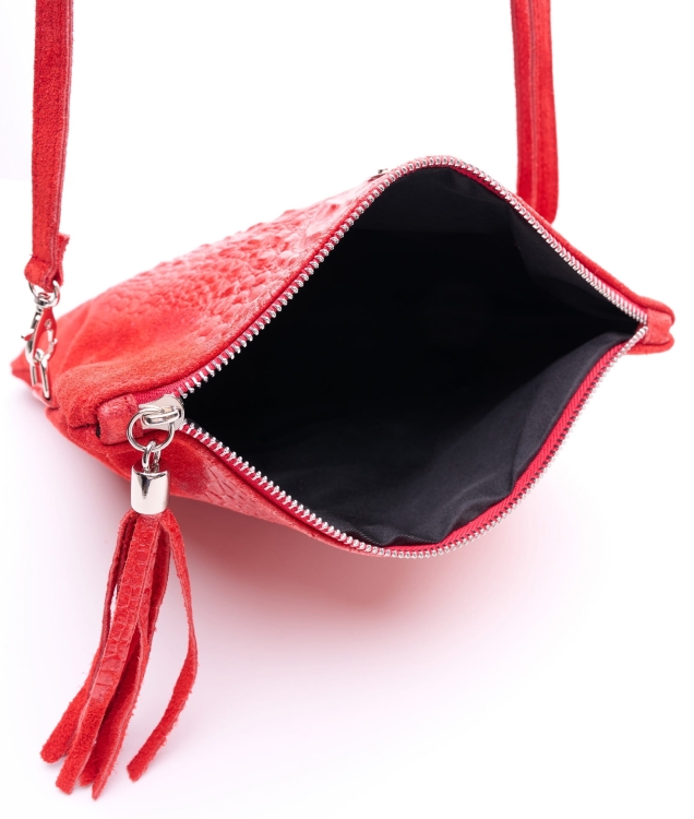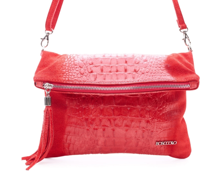 Skórzana kopertówka zkładana którą można nosić w ręku lub na ramieniu, składa się z komory głównej i wewnętrznej kieszeńi na suwak.
