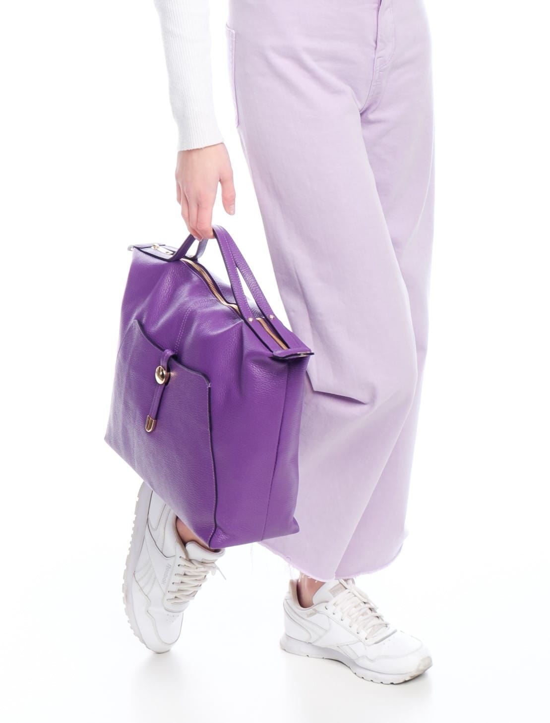 - na zewnątrz z przodu kieszeń zamykana na ozdobny pasek, z tyłu kieszeń na suwak