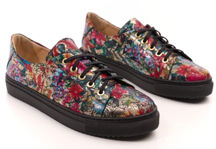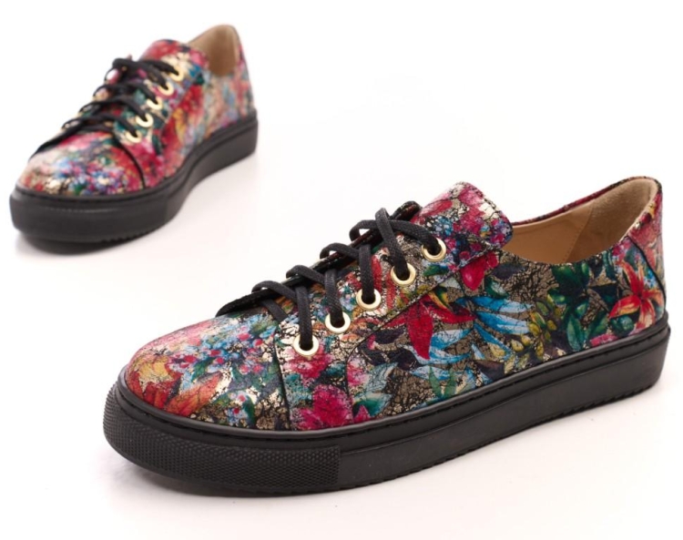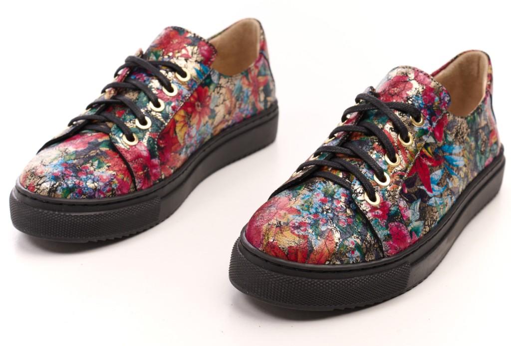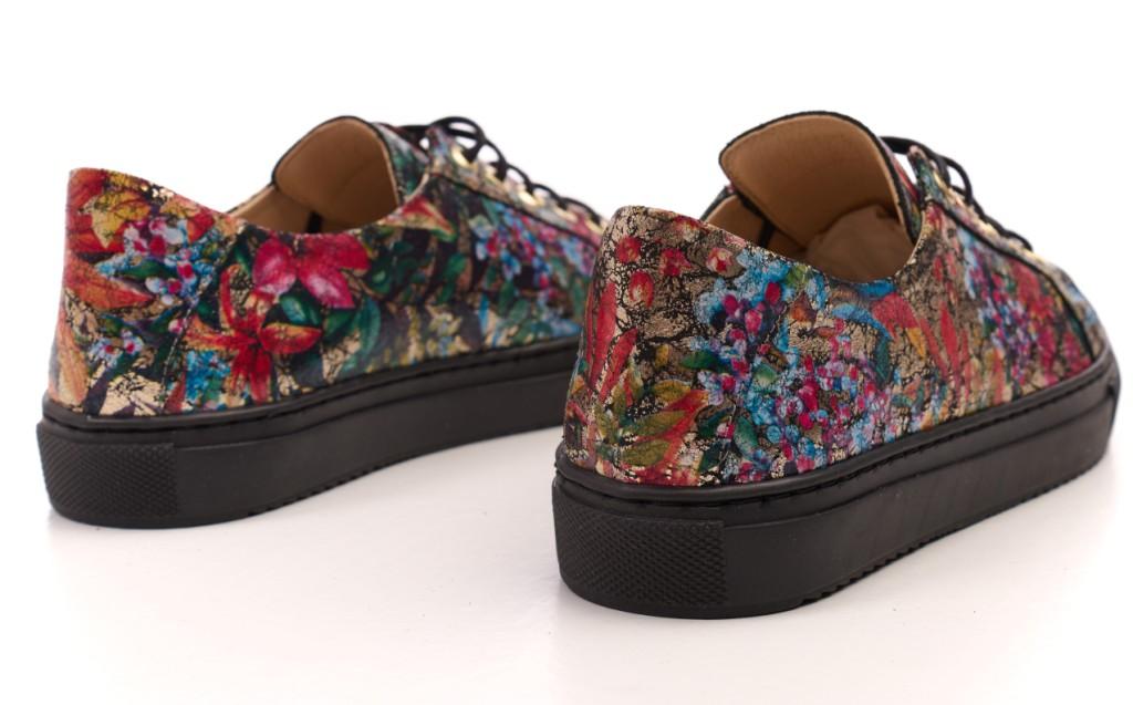 Skórzane trampki za kostkę z naturalnej skóry licowej z nadrukiem w kwiaty, sznurowane