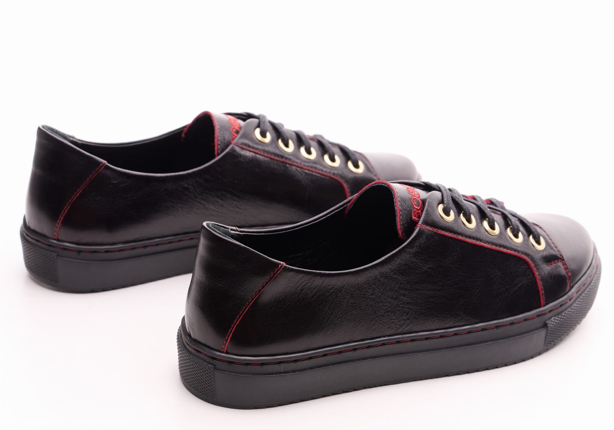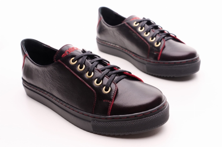 Skóra wykończona czerwonym rantem, czerwony haft z logo na języku.
