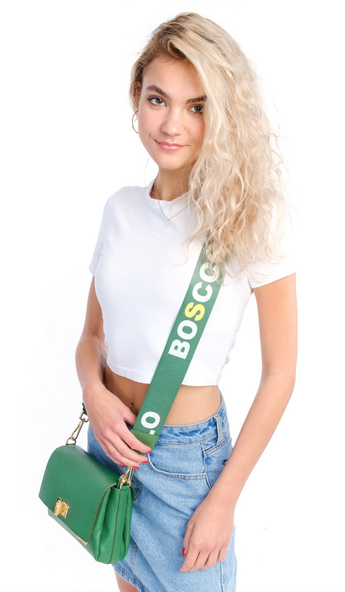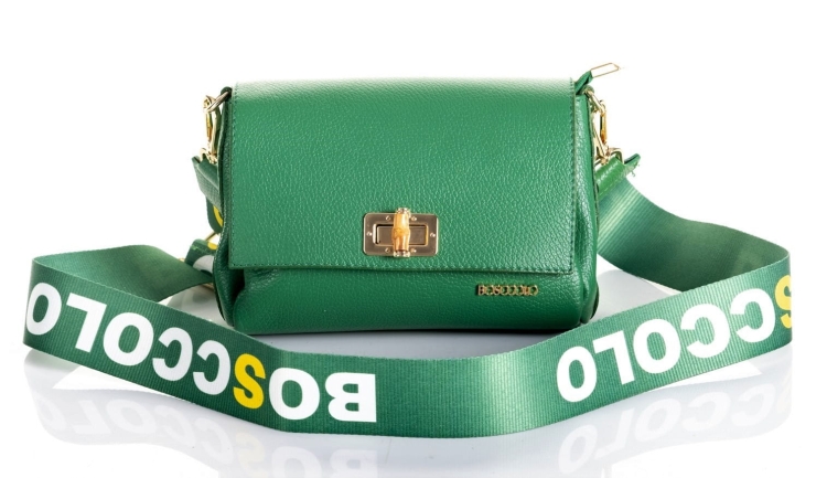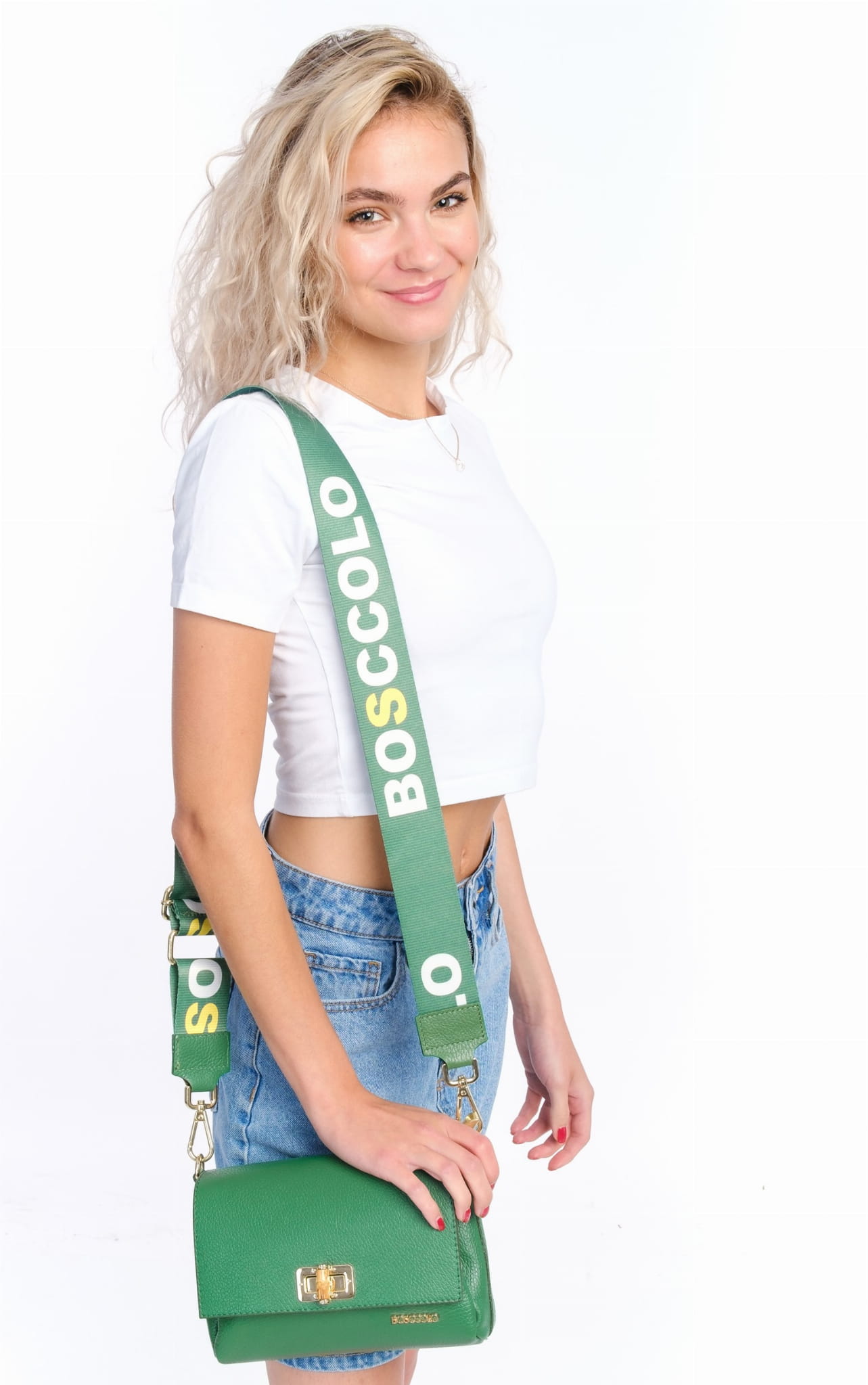 - dopinany szeroki na 5 cm pasek tekstylny z wzorem, skórzane końcówki w kolorze torebki, regulowany, max 135 cm