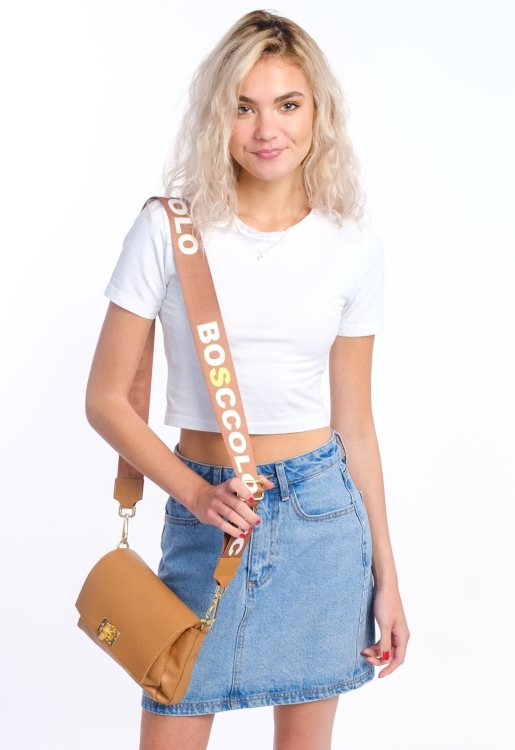 - dopinany szeroki na 5 cm pasek tekstylny z wzorem, skórzane końcówki w kolorze torebki, regulowany, max 135 cm