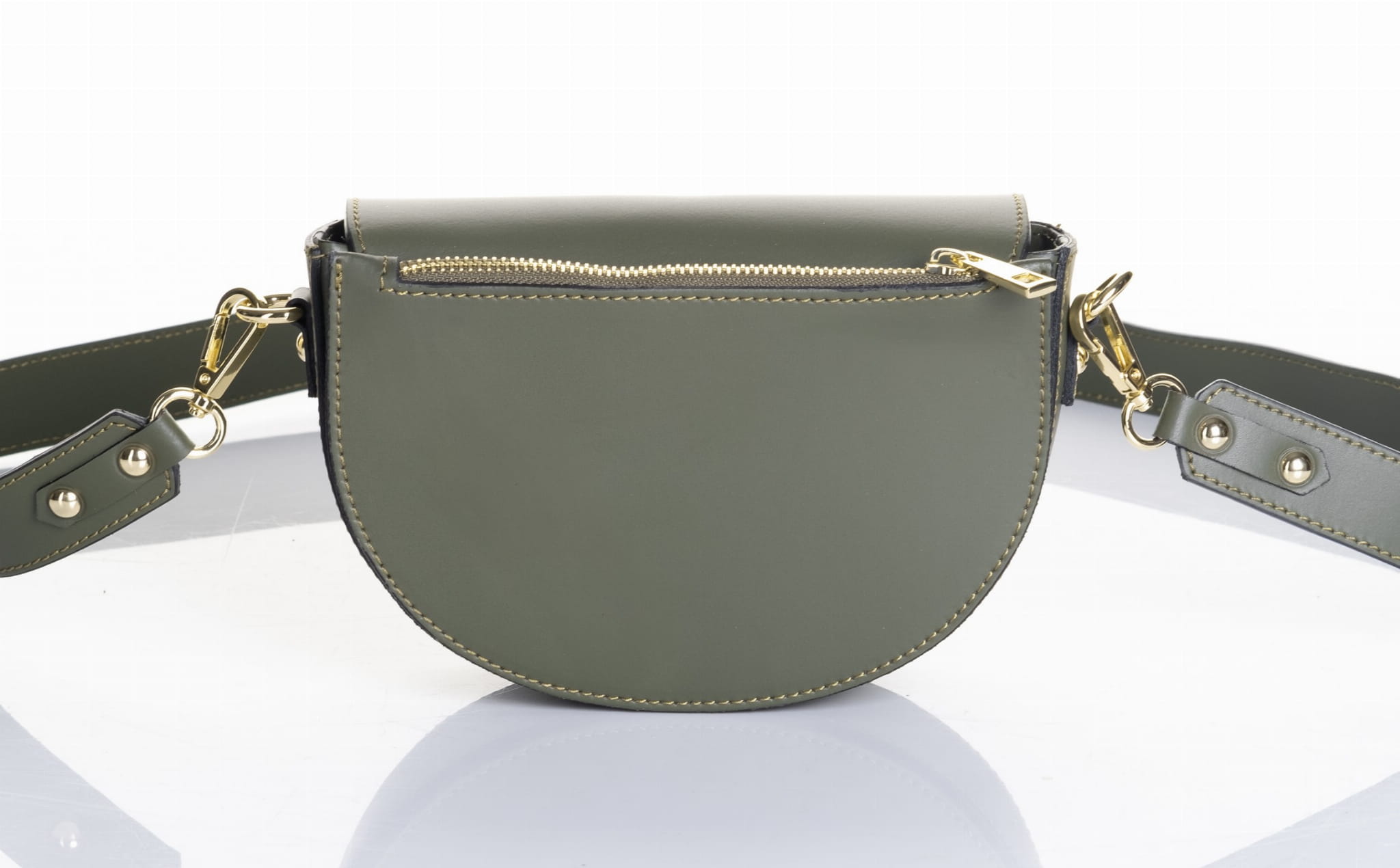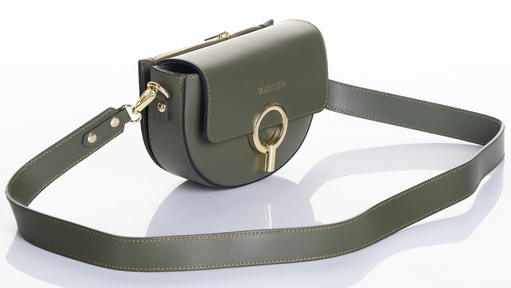 Torebka ze skóry naturalnej, do ręki lub na ramię, crossbody. Ozdobne zapiecie. Półokrągły kaształt.